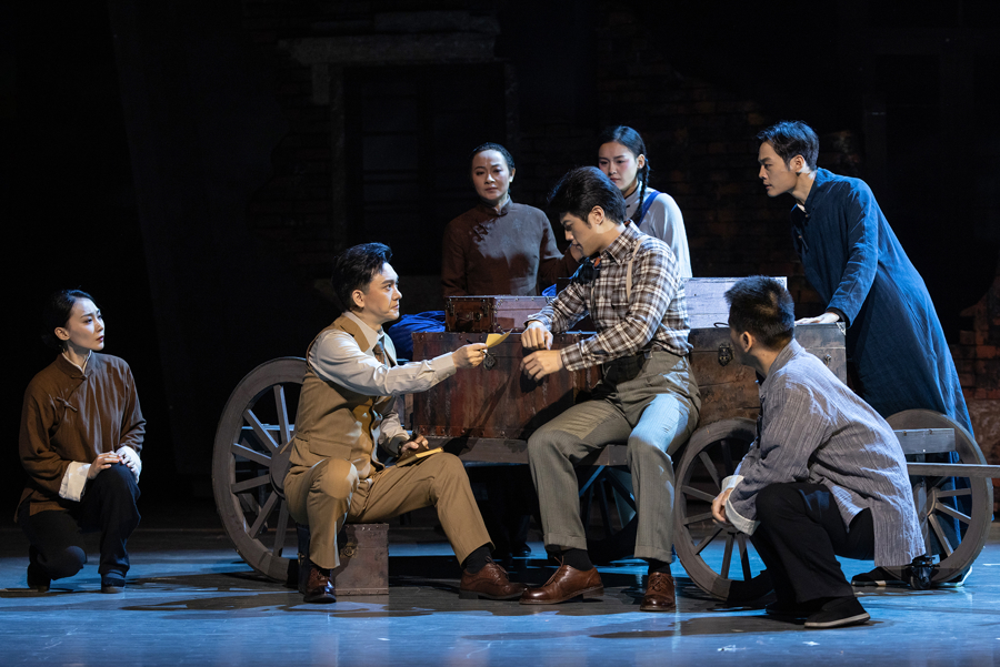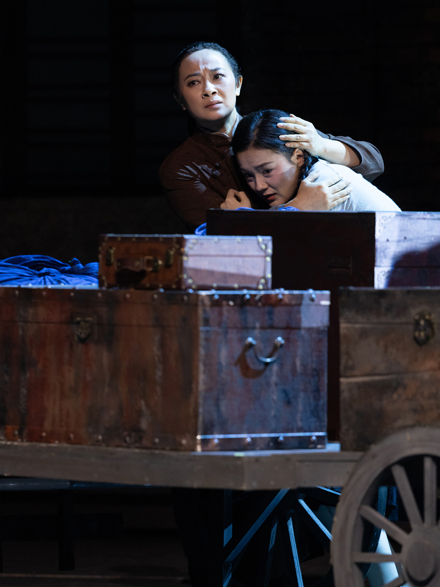 《点翠》舞台、设计如同一首无声的诗,以细腻的笔触勾勒历史的明暗与情感的波澜。解构的建筑框架、斑驳的砖墙与冷峻的几何箱体交错、倾轧、叠映,形象再现战火摧残下城市的创伤与人民内心的创痛。多媒体与灯光的运用,成为推动叙事、渲染情绪的“隐形角色”。它们时而如《西行漫记》般纪实冷峻,时而如“点翠”头面般绚丽华彩,在虚实、冷暖之间自由穿梭,将1938年的迷茫、挣扎与希望编织成令人难忘的舞台画面。