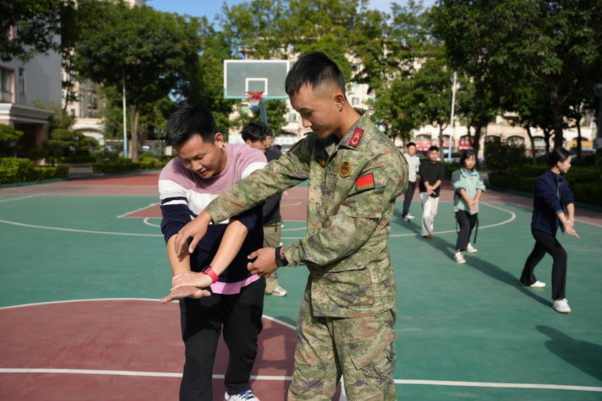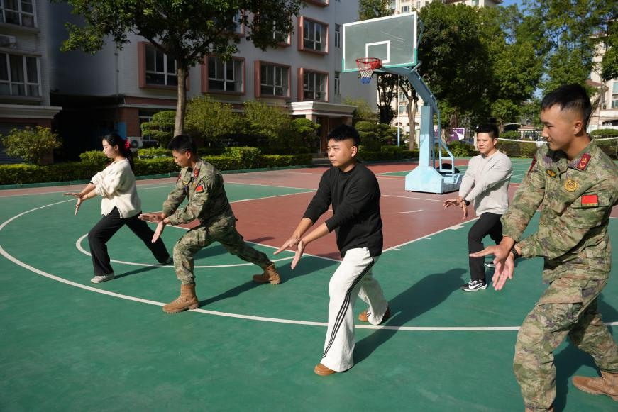 操场上,无论是刚劲有力的弓步冲拳,还是迅猛凌厉的穿喉弹踢,民兵教练员们从最基础的动作要领讲解,到一招一式的耐心精准示范,再到分组指导练习,教练员们严谨细致的指导与老师们铿锵有力的口号遥相呼应,既展现了军人作风的感染力,又体现了老师们精益求精的学习态度。
